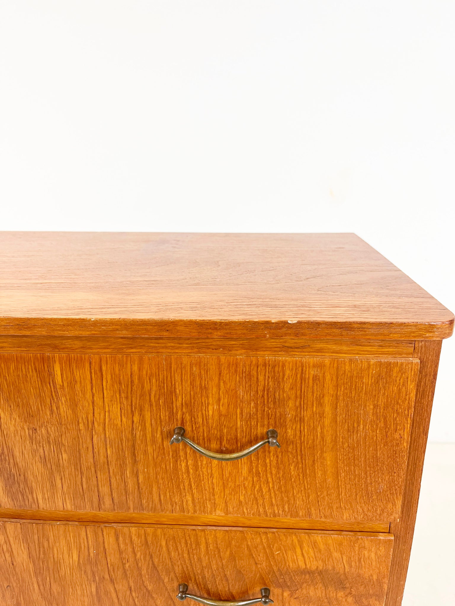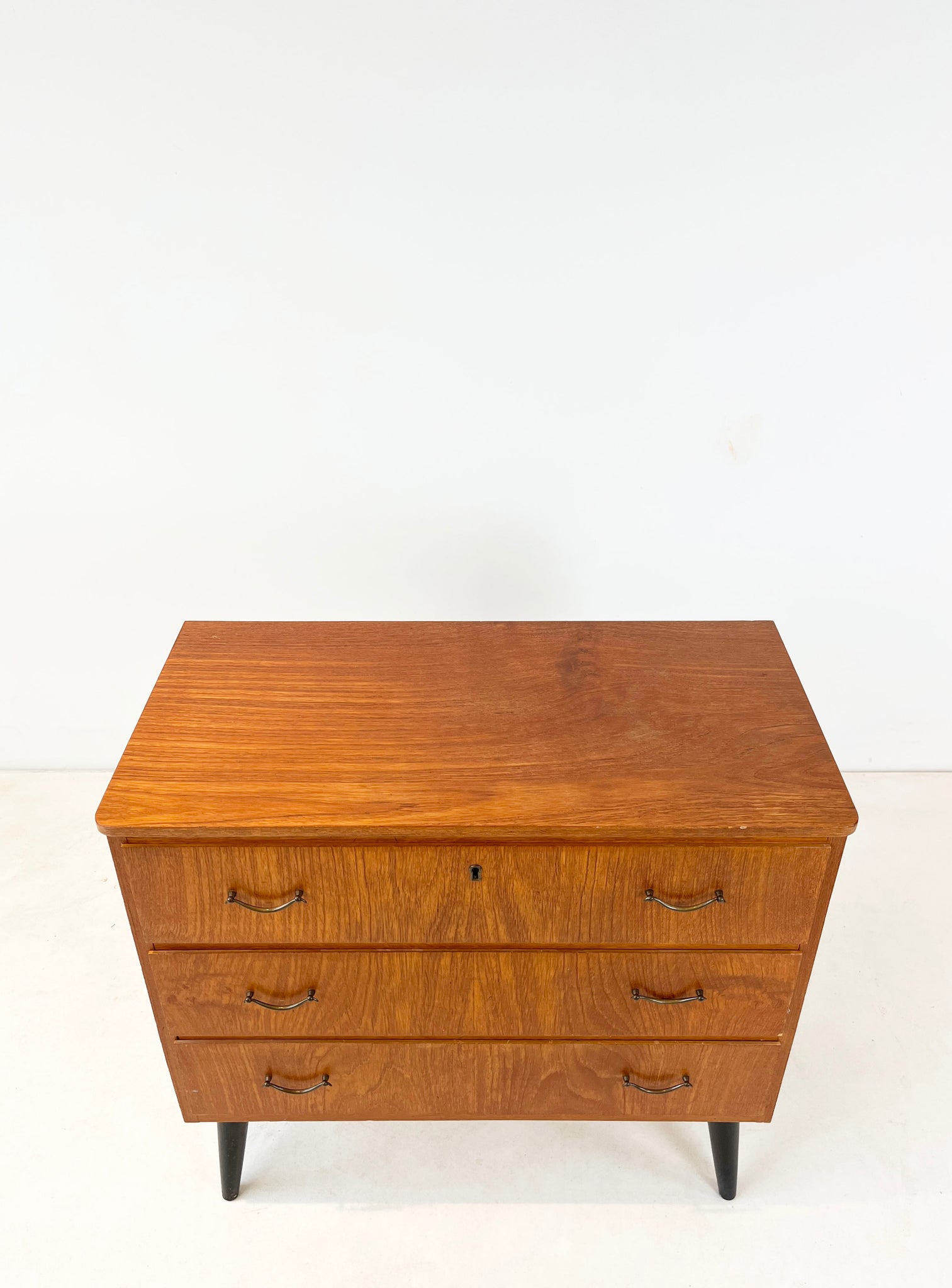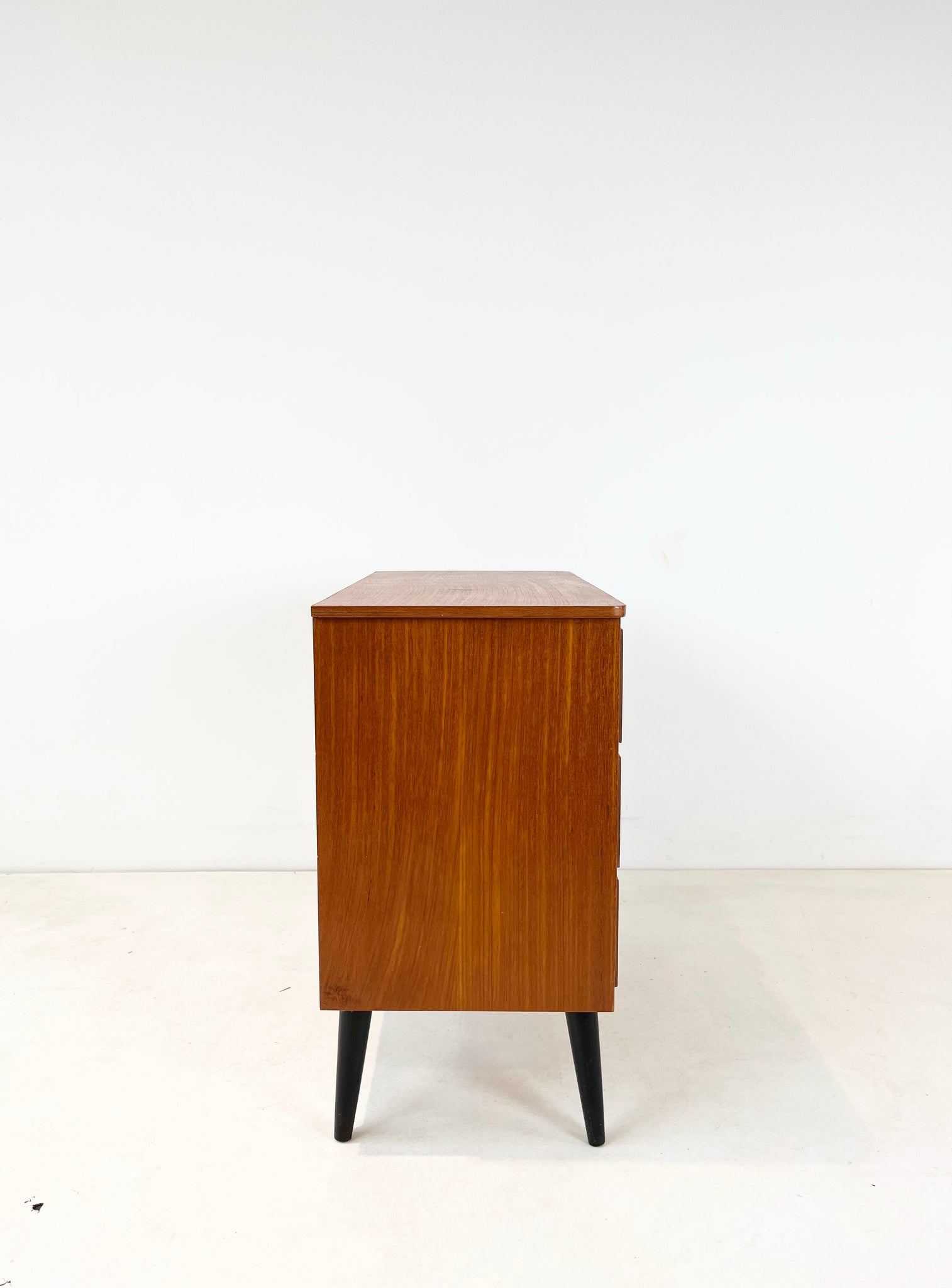 Vintage ladekast van teakhout, gerestaureerd en in uitstekende staat. Met metalen handgrepen en zwarte poten. Uit Zweden.