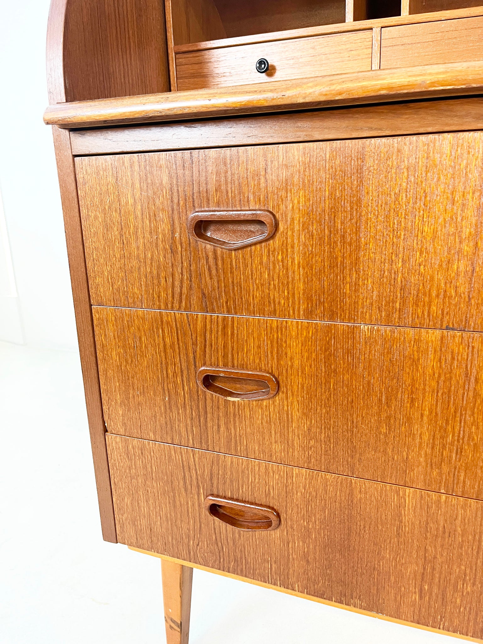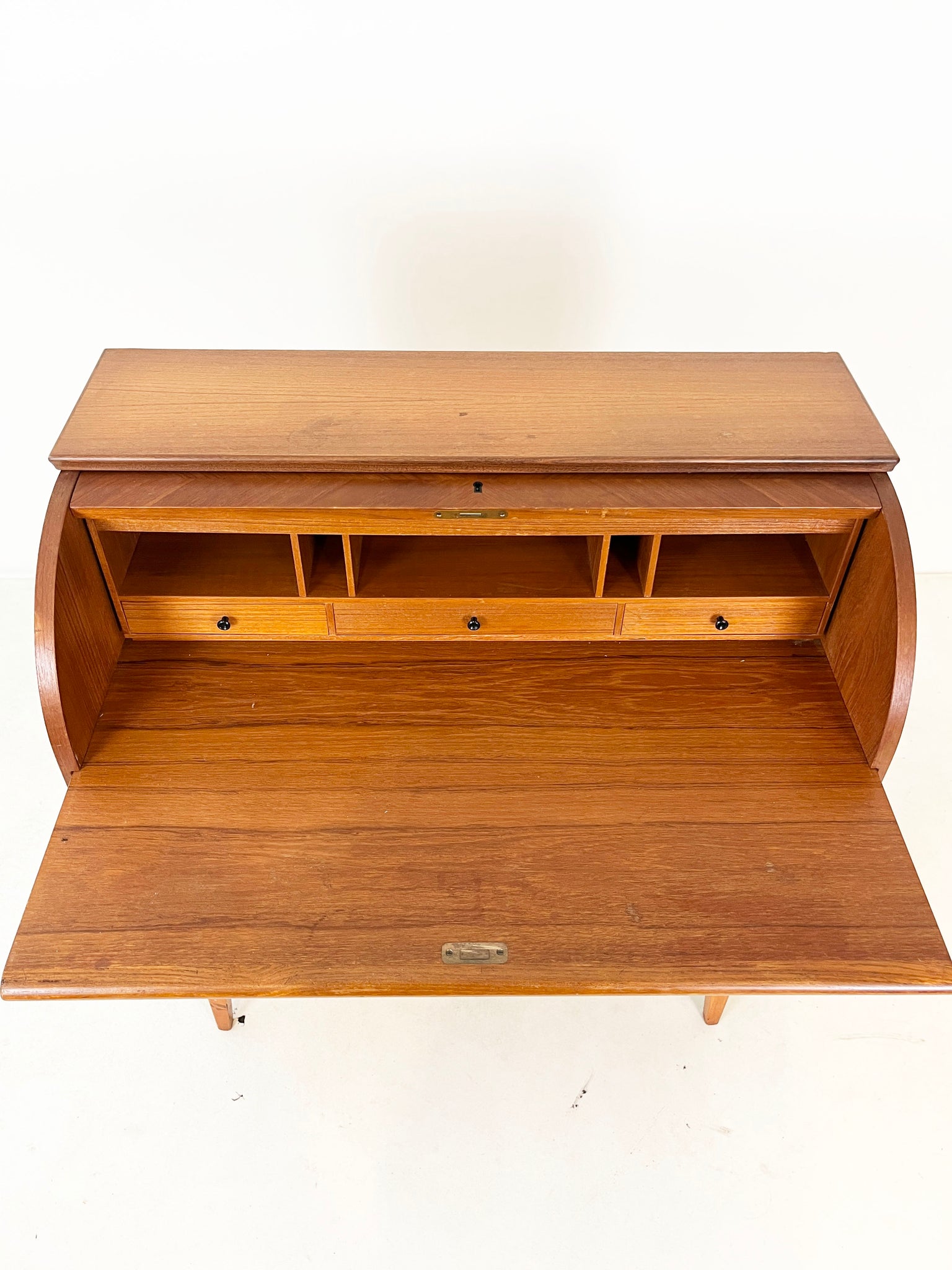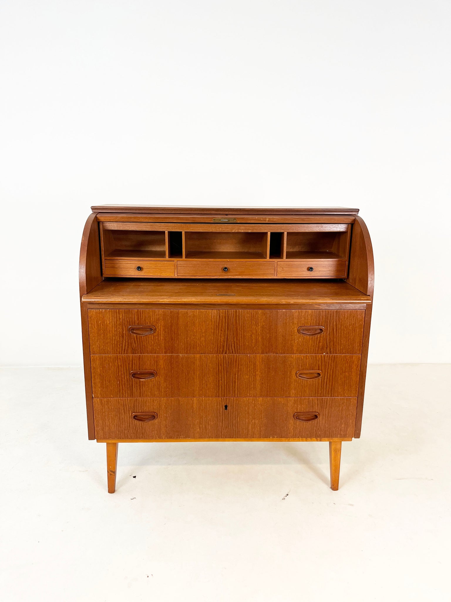 Prachtig naar Zweeds design vormgegeven mid century secretaire uit de jaren zestig. Een perfect stuk voor in de woonkamer of studeerkamer. Deze prachtige secretaire heeft een rolltop bovenkant, en hierachter vind je opbergruimte voor je kleinere spullen in de vorm van vakjes en lades. Het werkblad kan worden uitgeschoven zodra de rolltop naar boven is gerold. Over het algemeen is deze secretaire in erg goede staat, en erg mooi afgewerkt. Werkend slot.