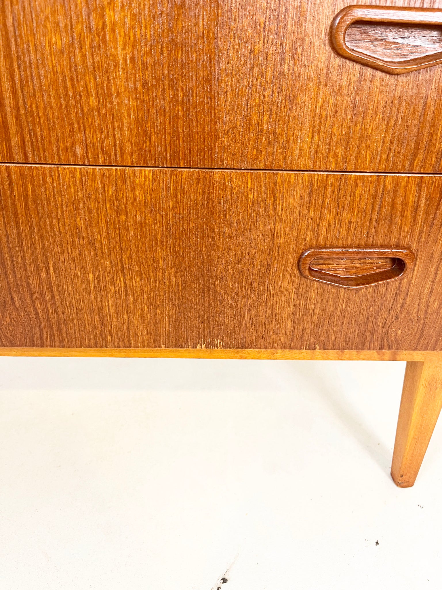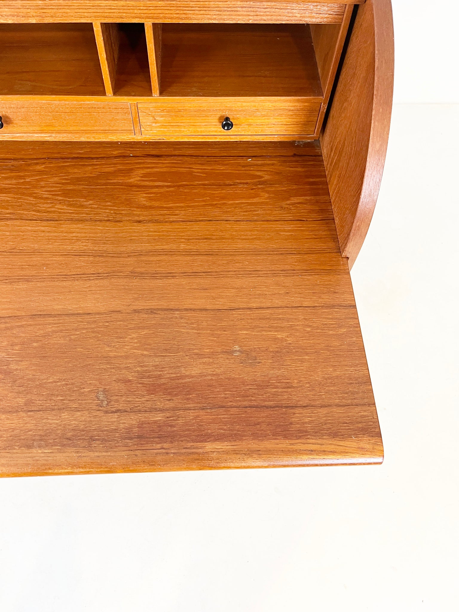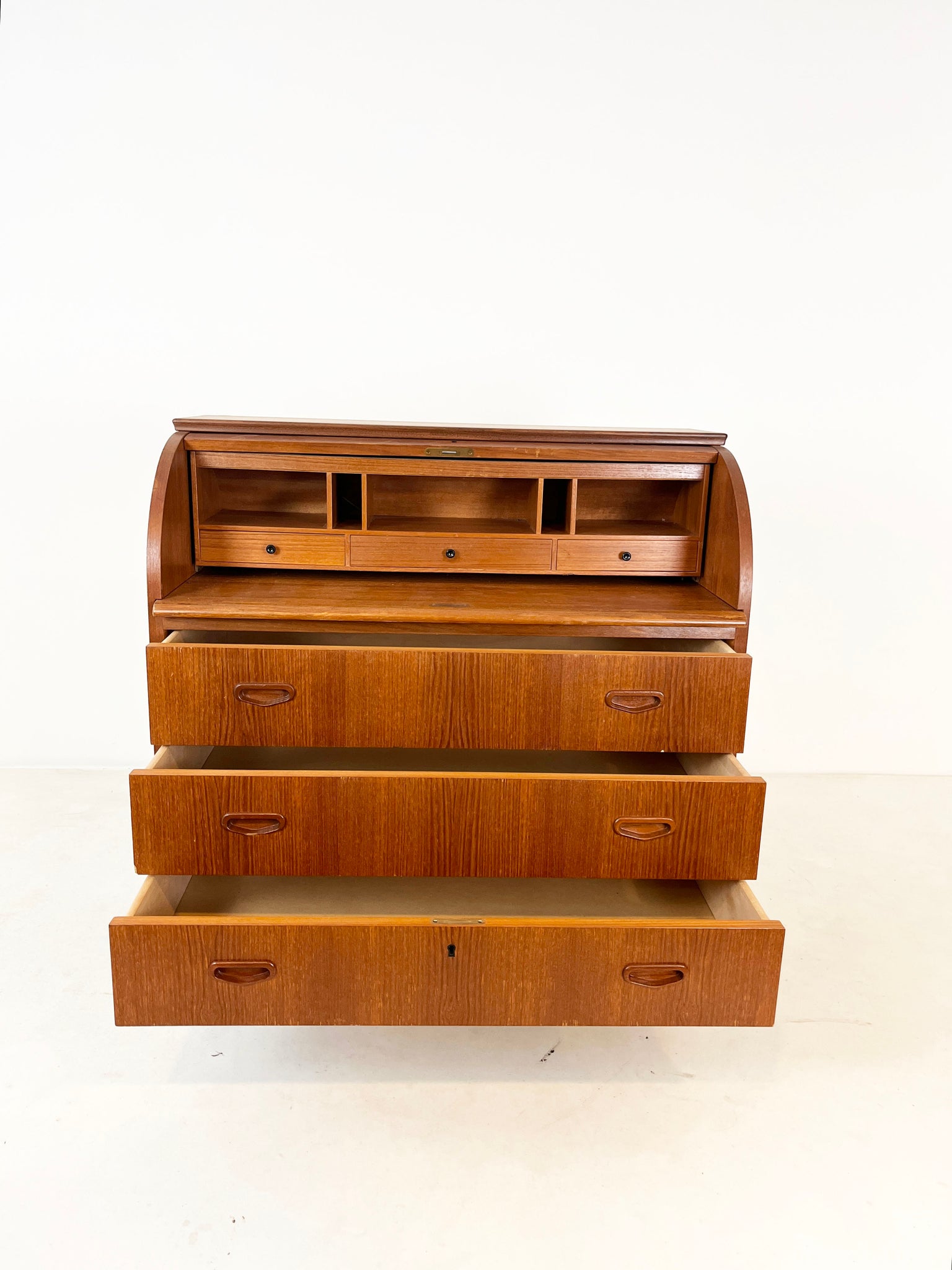 Prachtig naar Zweeds design vormgegeven mid century secretaire uit de jaren zestig. Een perfect stuk voor in de woonkamer of studeerkamer. Deze prachtige secretaire heeft een rolltop bovenkant, en hierachter vind je opbergruimte voor je kleinere spullen in de vorm van vakjes en lades. Het werkblad kan worden uitgeschoven zodra de rolltop naar boven is gerold. Over het algemeen is deze secretaire in erg goede staat, en erg mooi afgewerkt. Werkend slot.