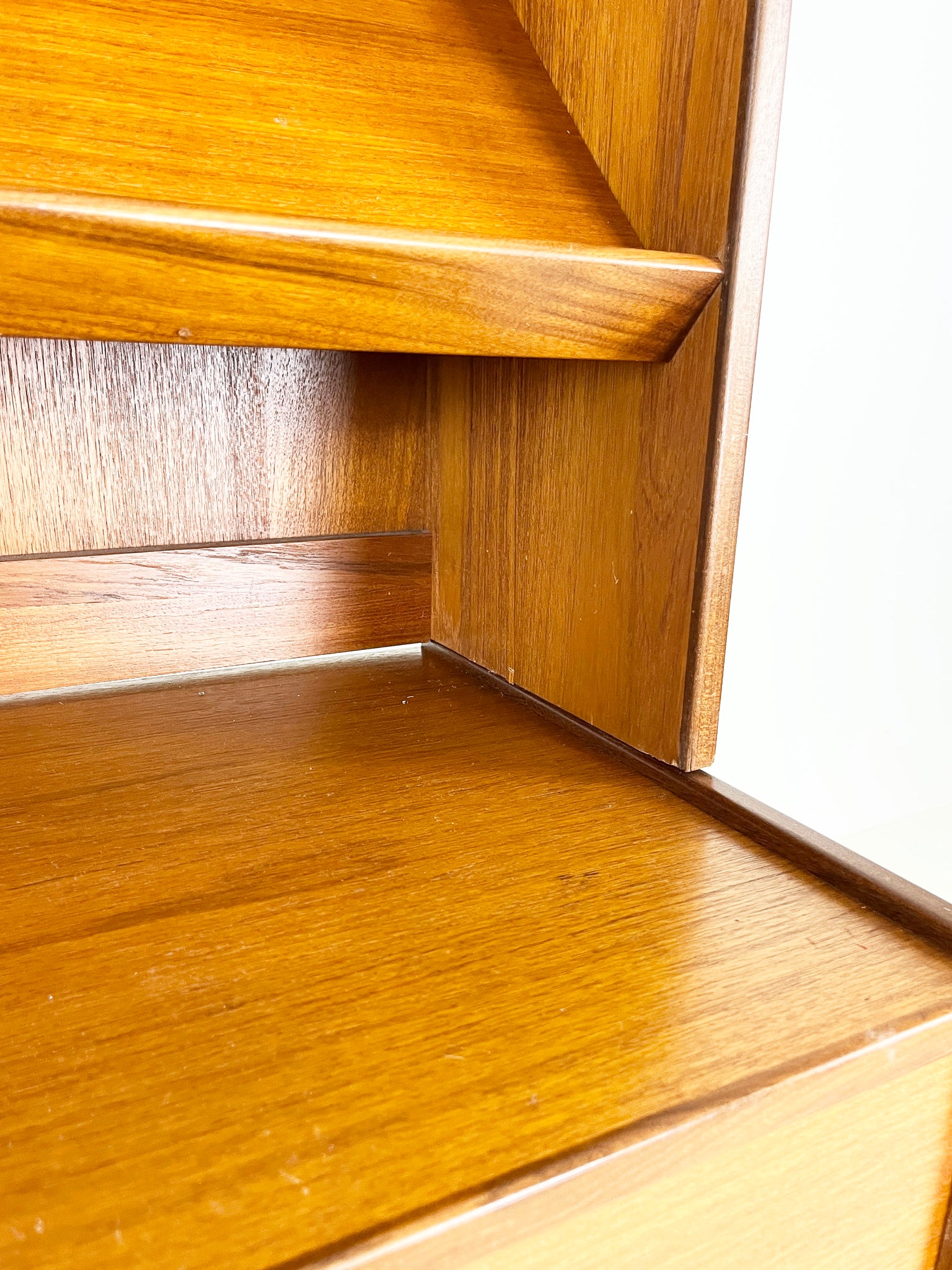 Prachtige kast met planken en lades, bestaande uit twee delen (boven- en onderkast), met een diagonale displayplank. In goede staat, met wat kleine beschadigingen die zichtbaar zijn op de foto’s.