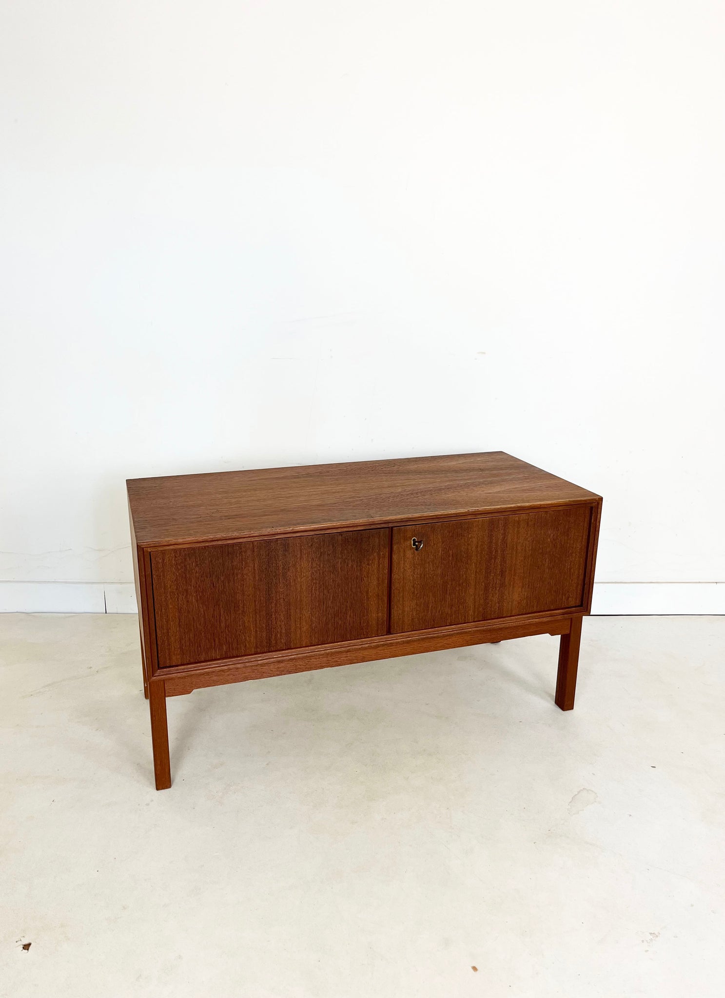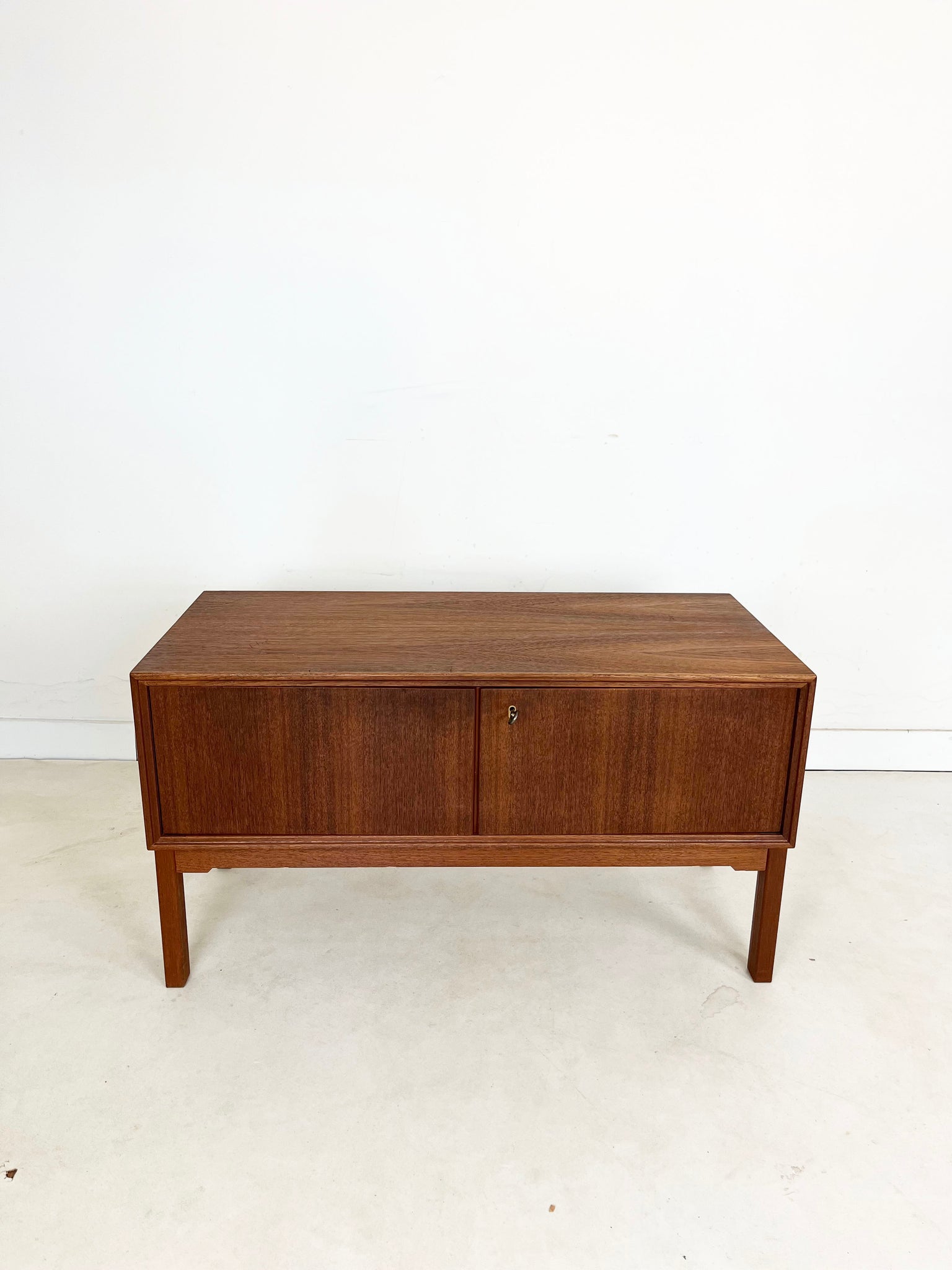 Low teak cabinet in good condition. Beautiful warm, dark brown color, with a working lock.