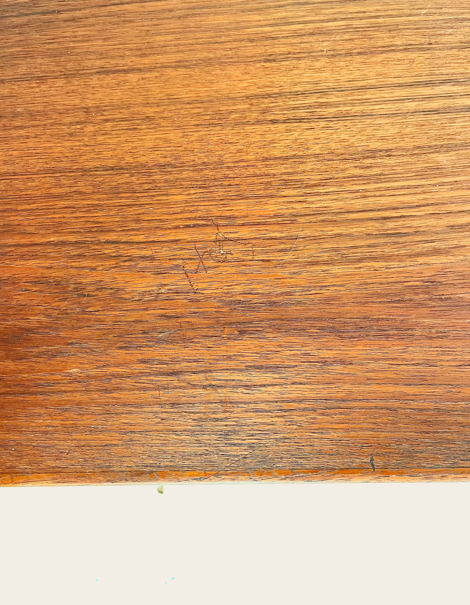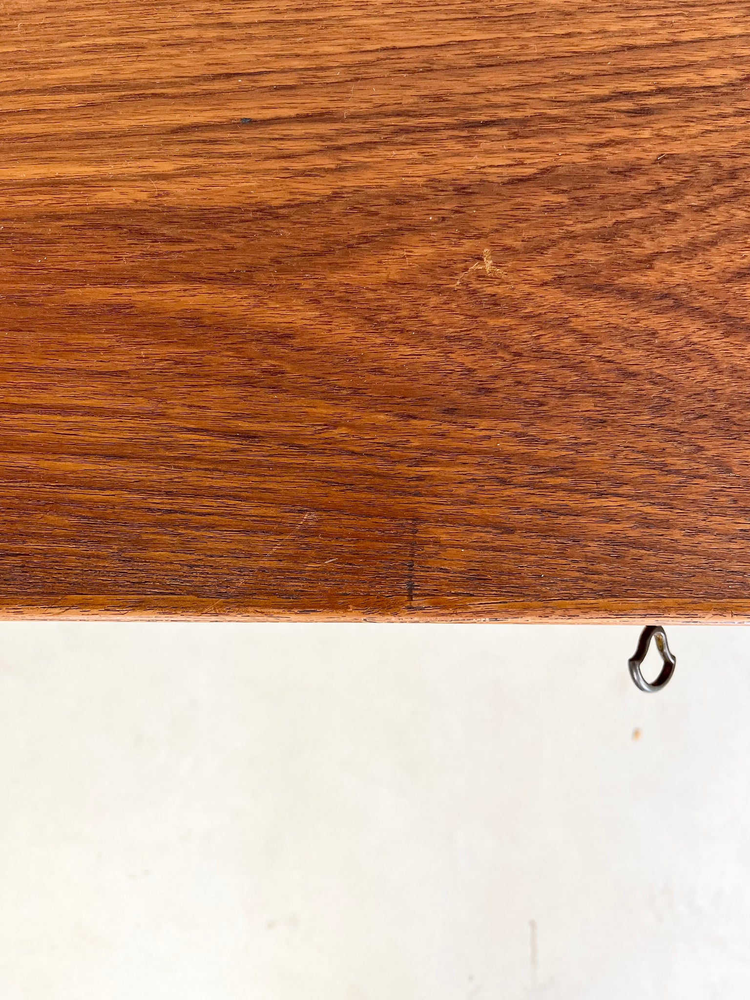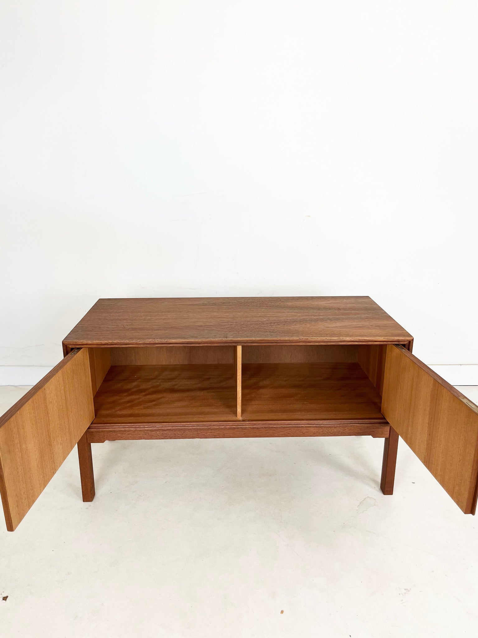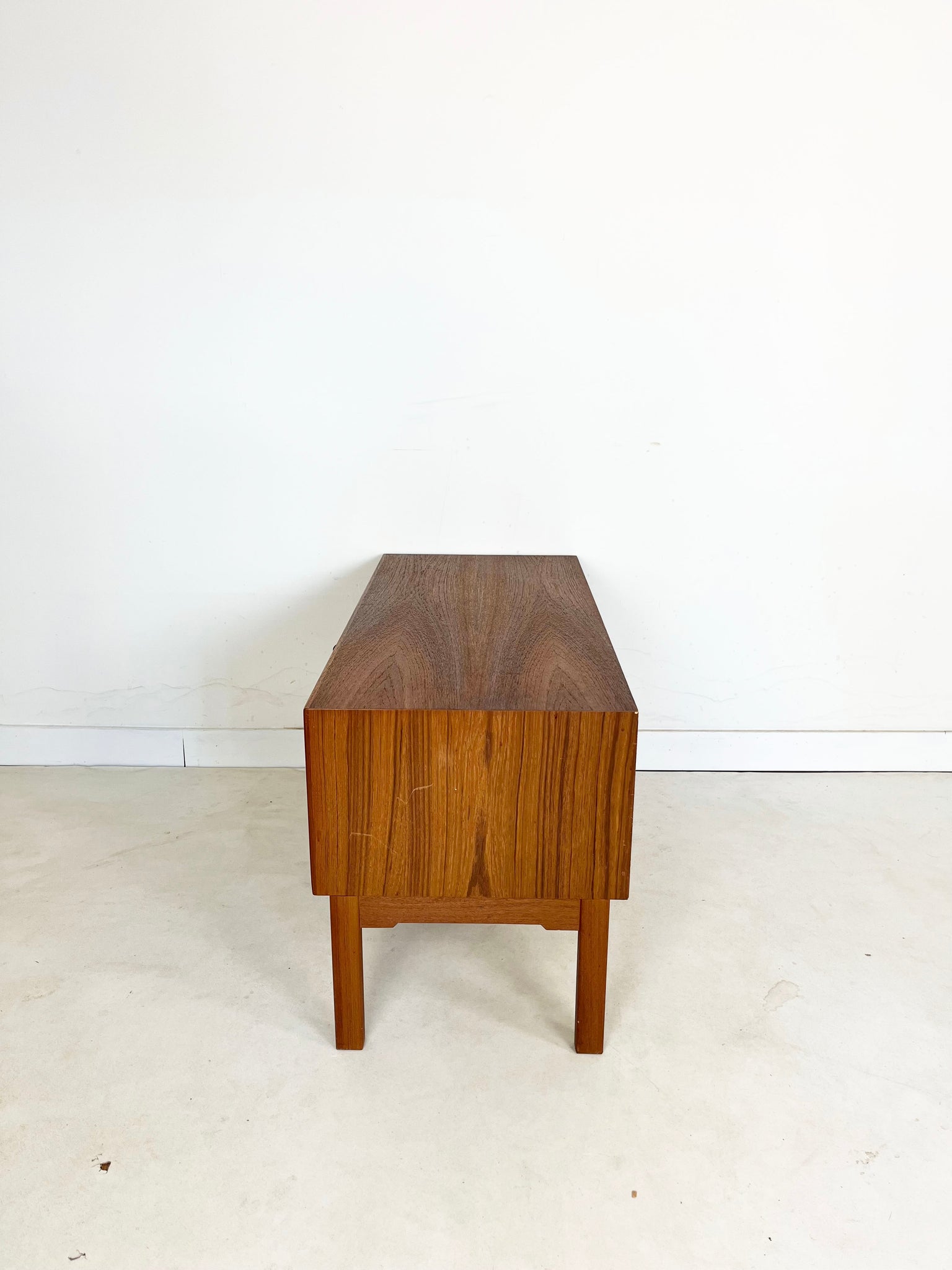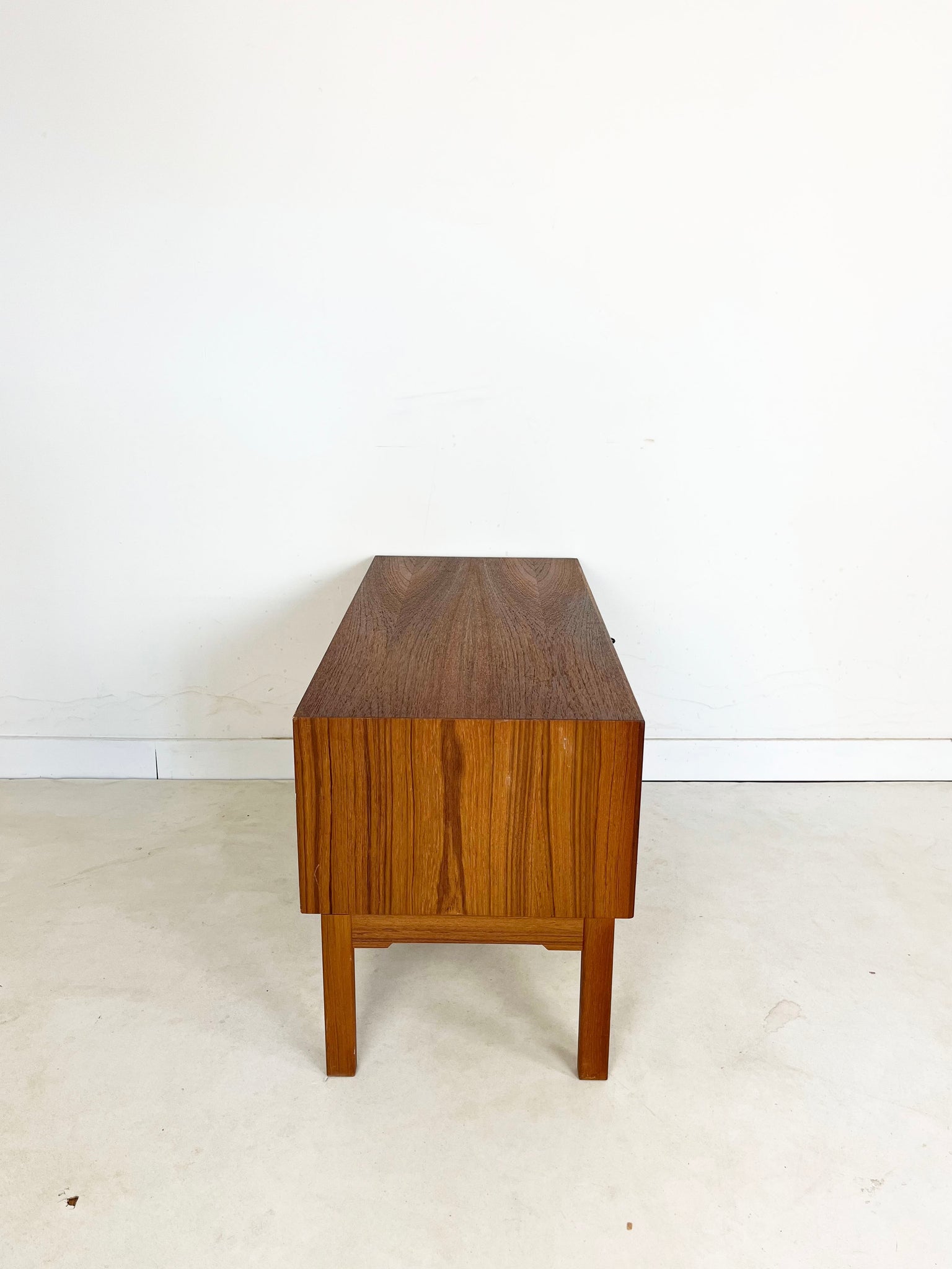 Lage teak kast in goede staat. Mooi warm en donker bruin van kleur. Werkend slot.