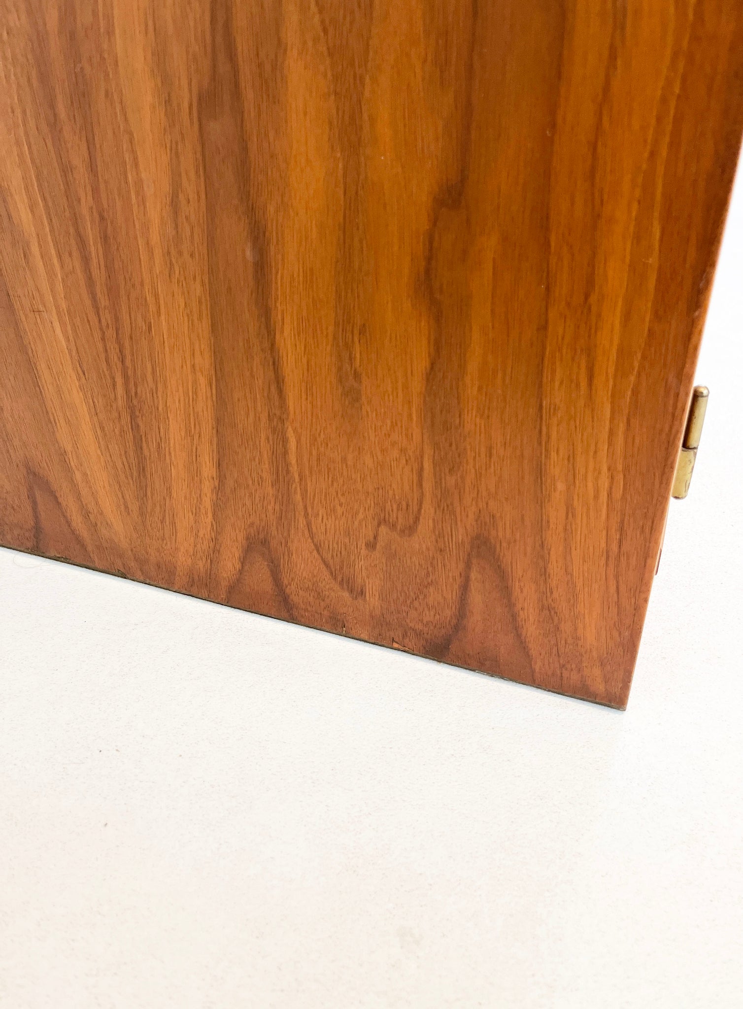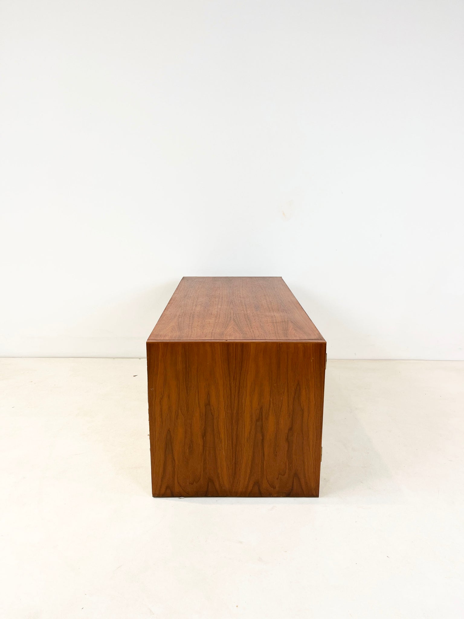 Beautiful vintage low teak cabinet with unique metal handles. In good condition; the top has been restored.