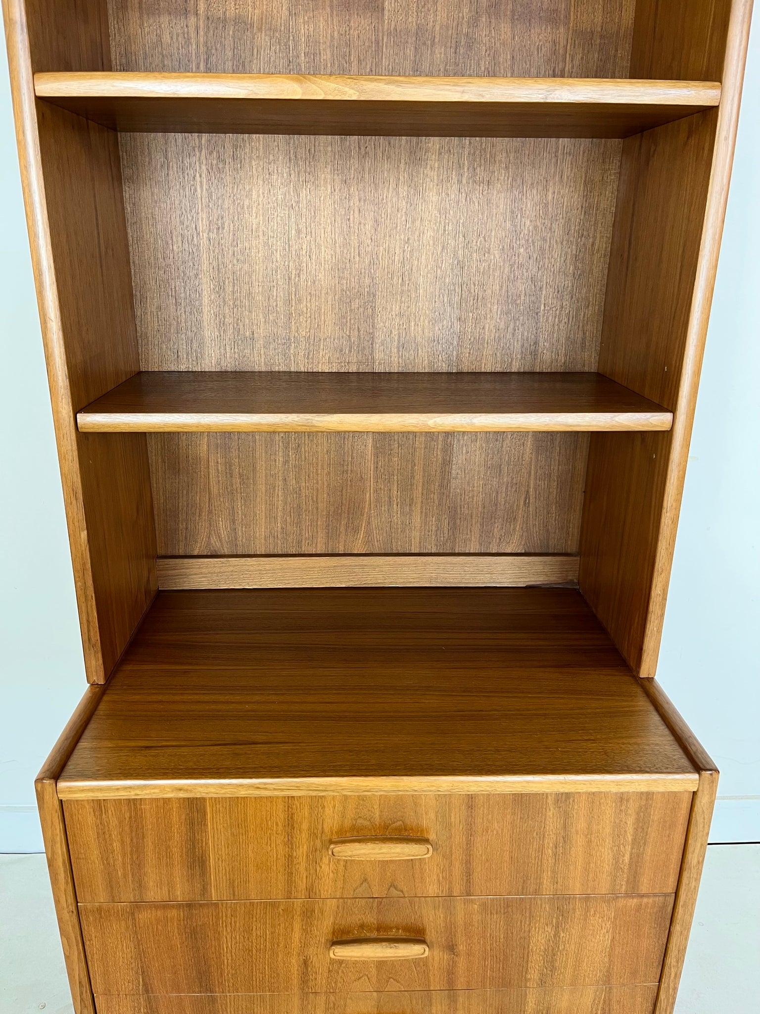 Smalle teakhouten kast met verstelbare planken en lades, in goede staat. Aan de achterkant is een kleine reparatie uitgevoerd (zie foto’s).