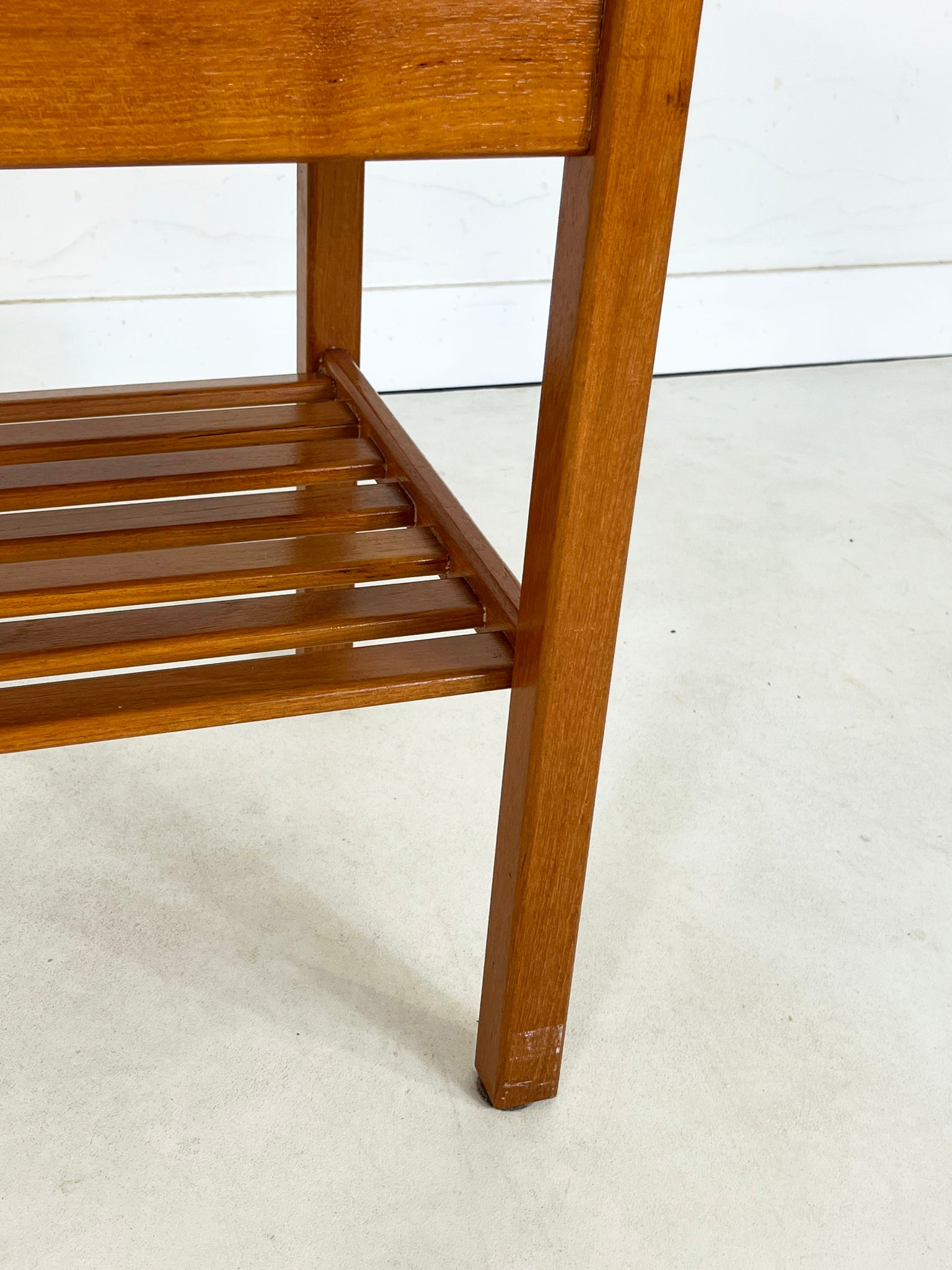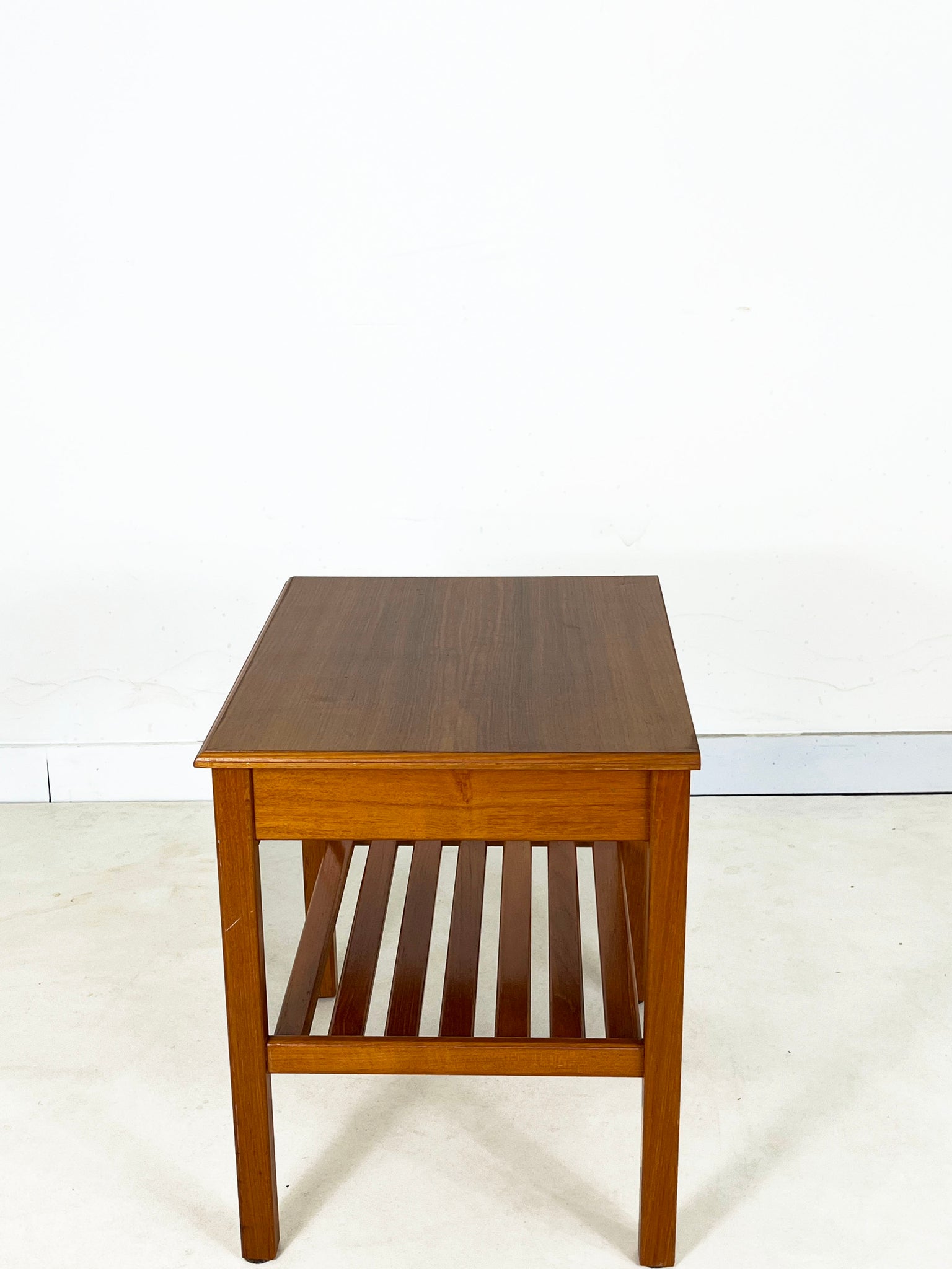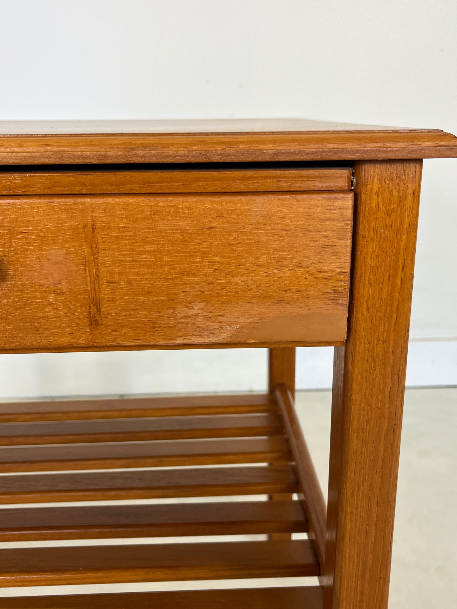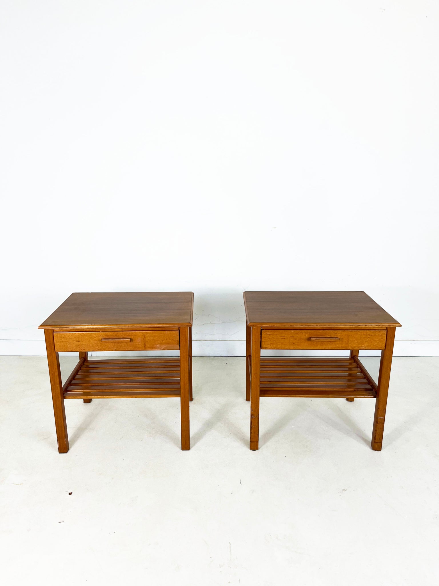 Set of 2 beautiful teak nightstands from Sweden. Professionally restored, stable, and sturdy. One of the drawers has a small repair (see photos), which is barely noticeable in person.