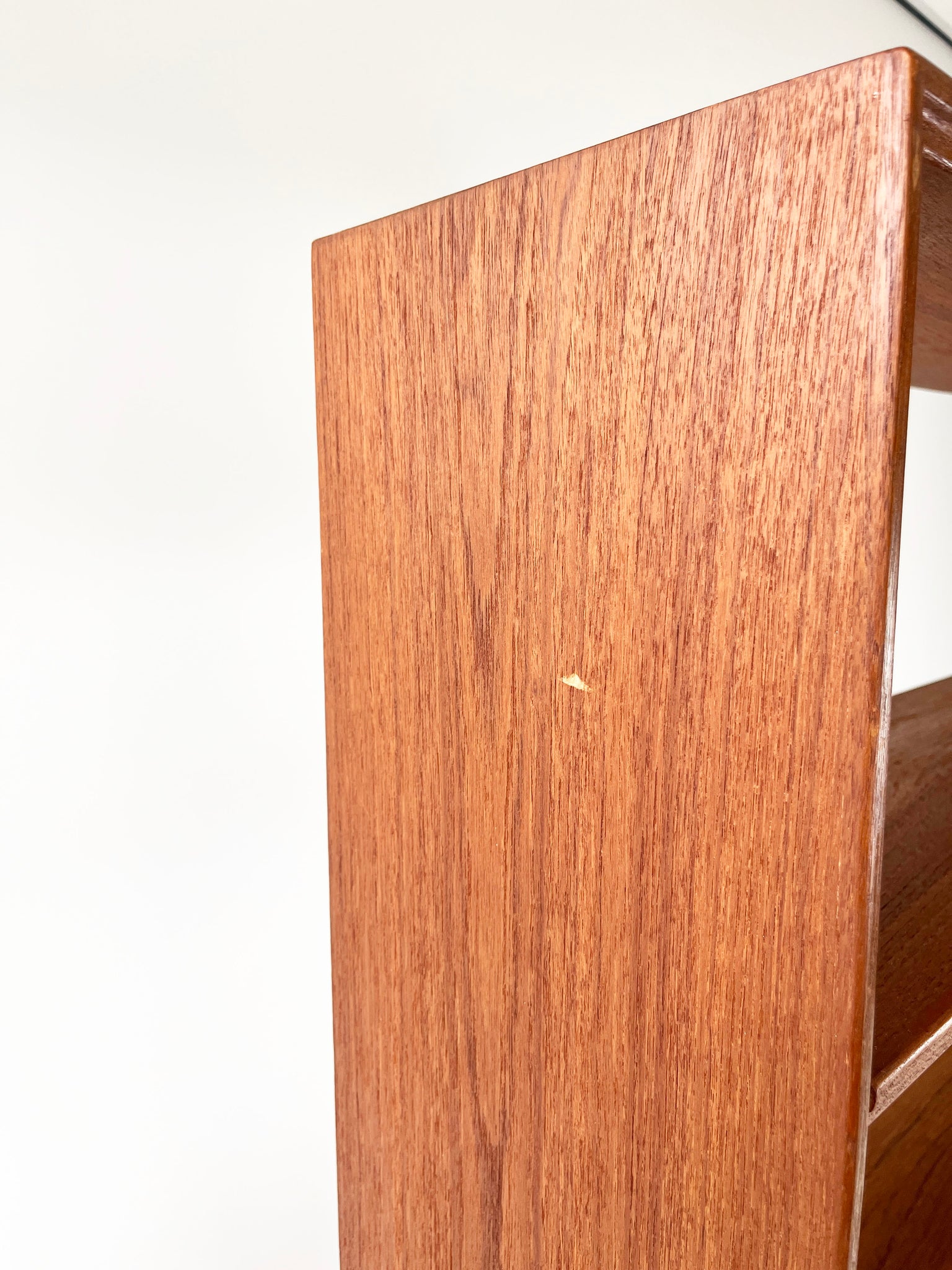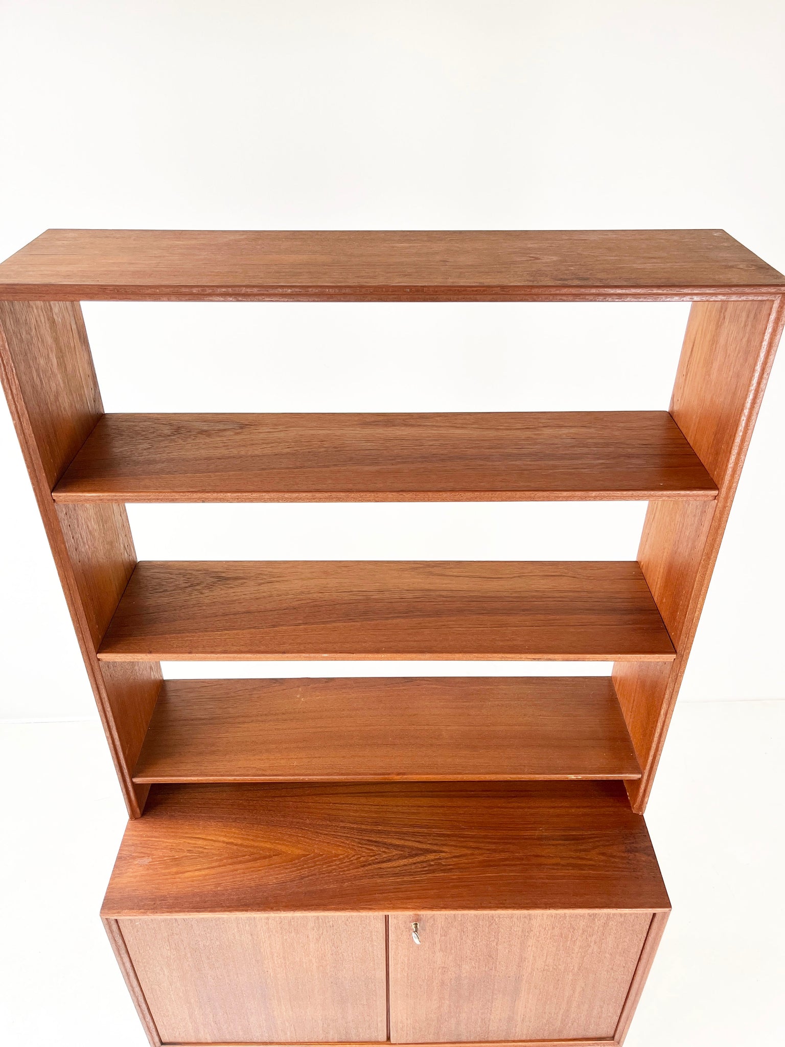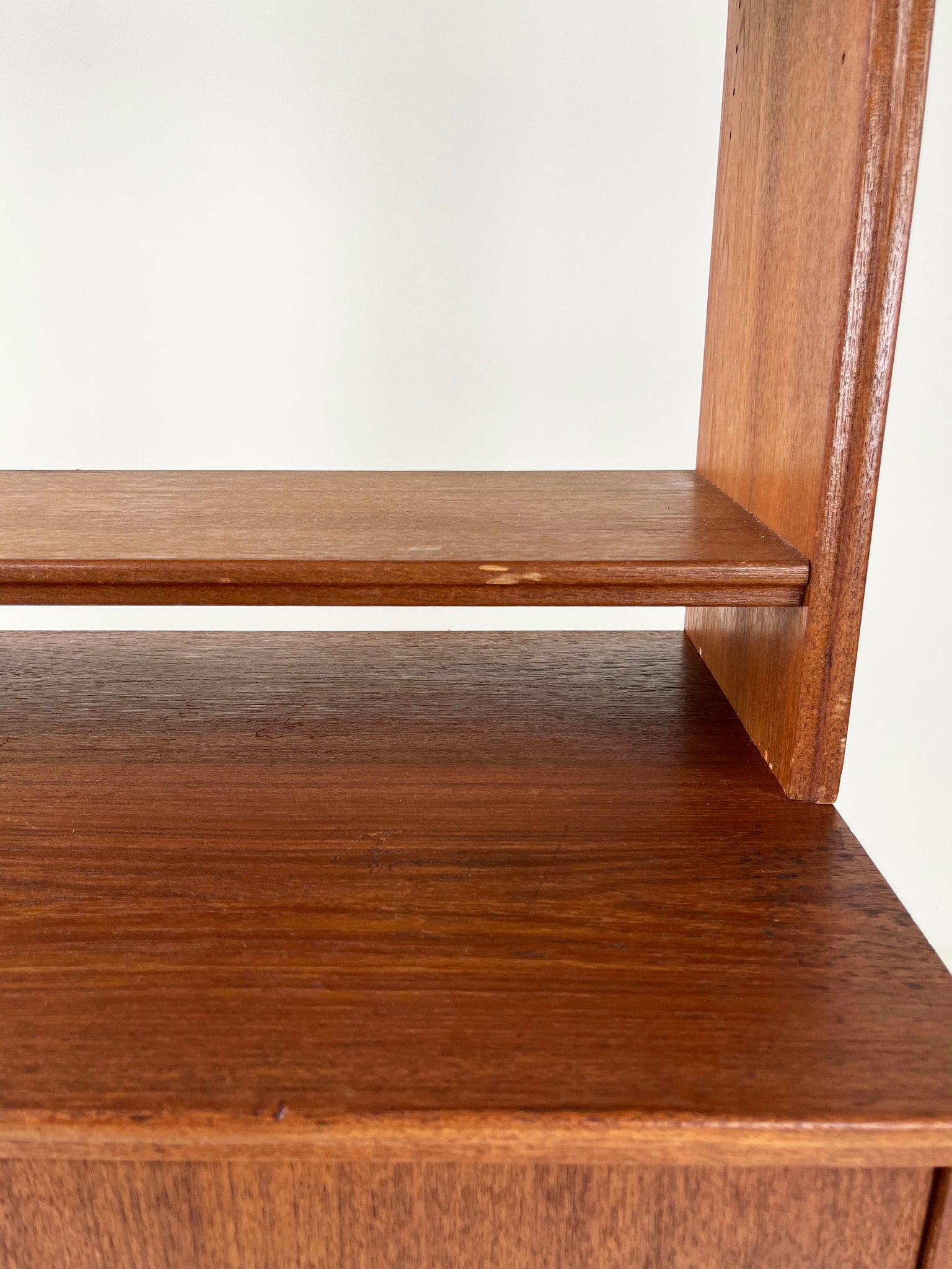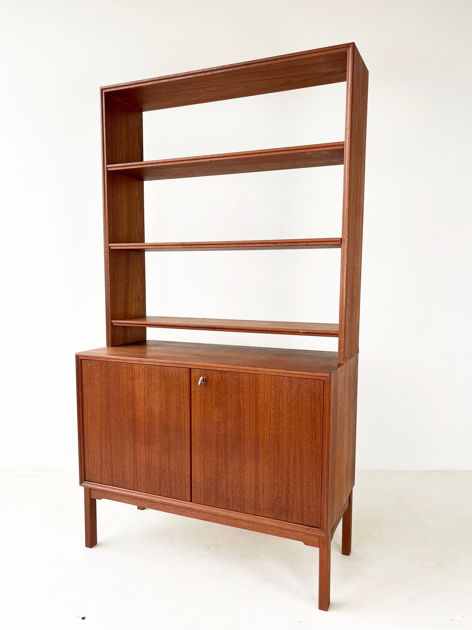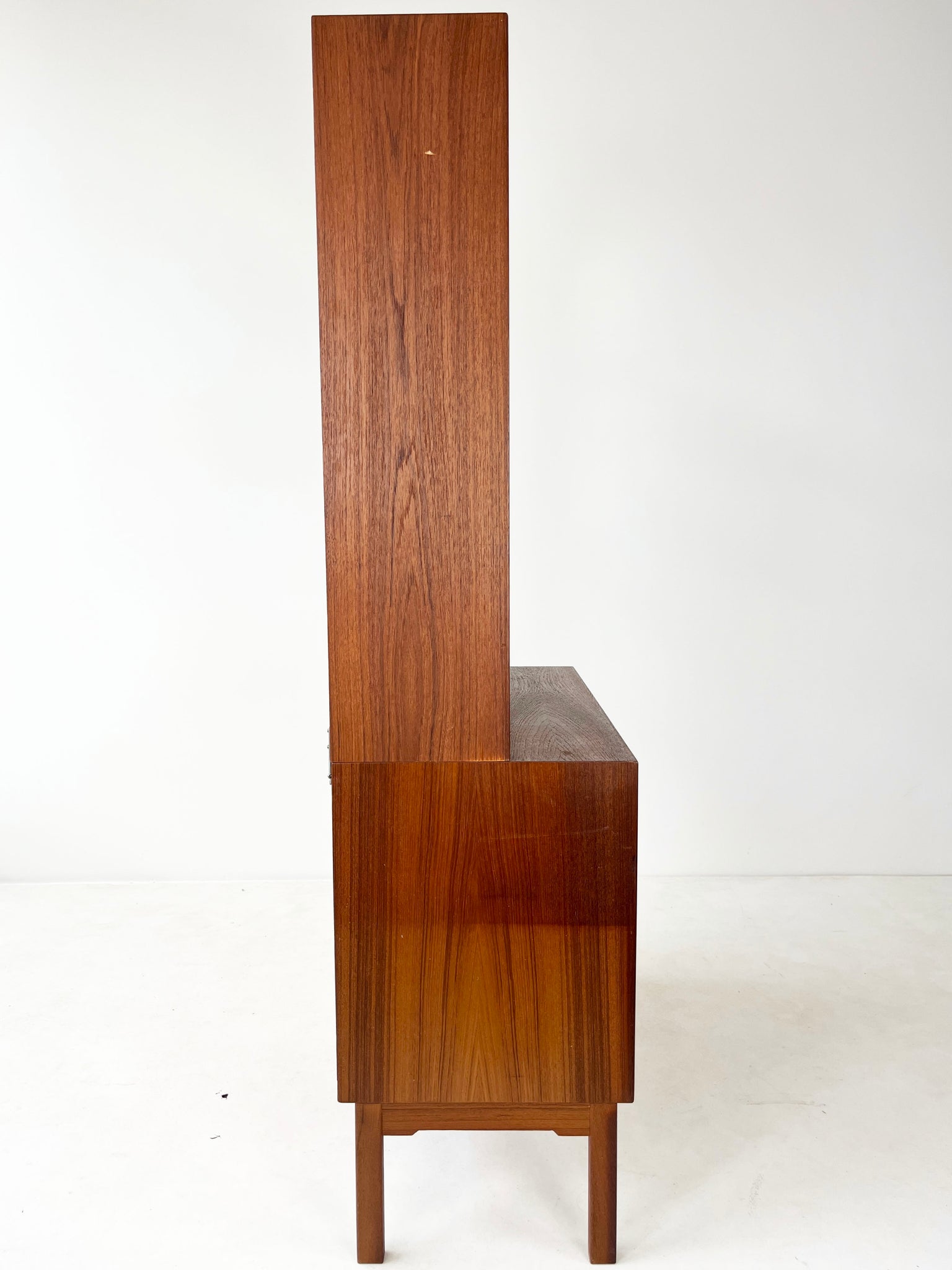 Sleek vintage wall cabinet made of beautiful dark teak. The bookshelf section sits separately on top of the lower cabinet, which is convenient for transport, but can easily be attached together. Comes with a working lock. Some light veneer damage, visible in the photos.