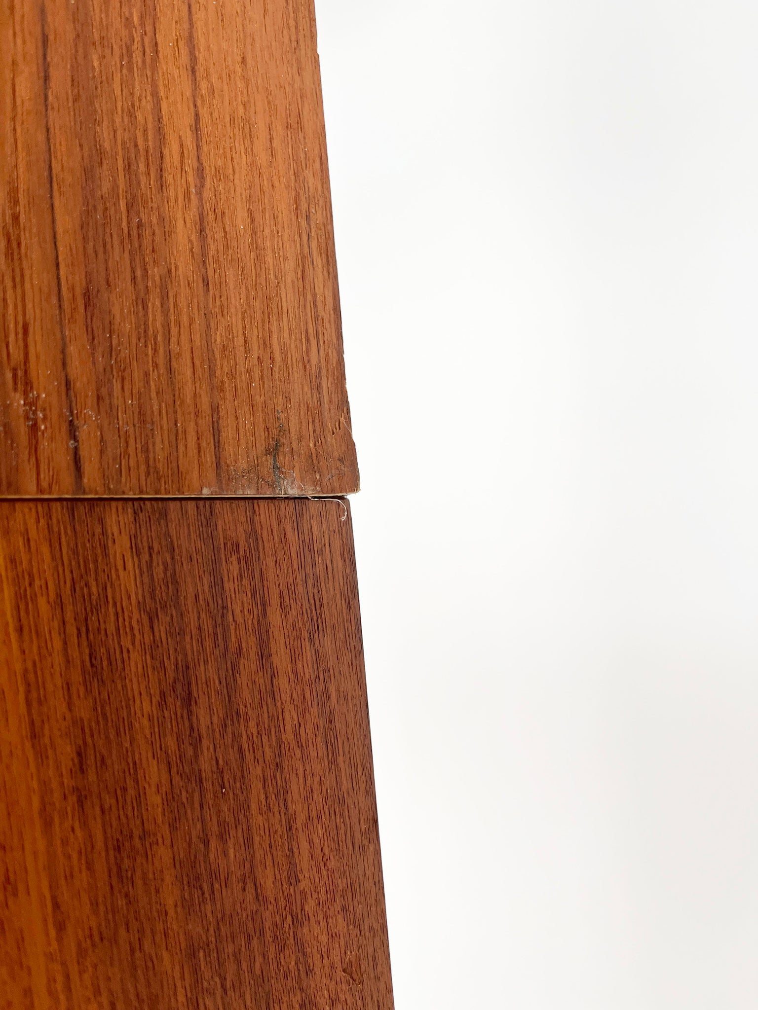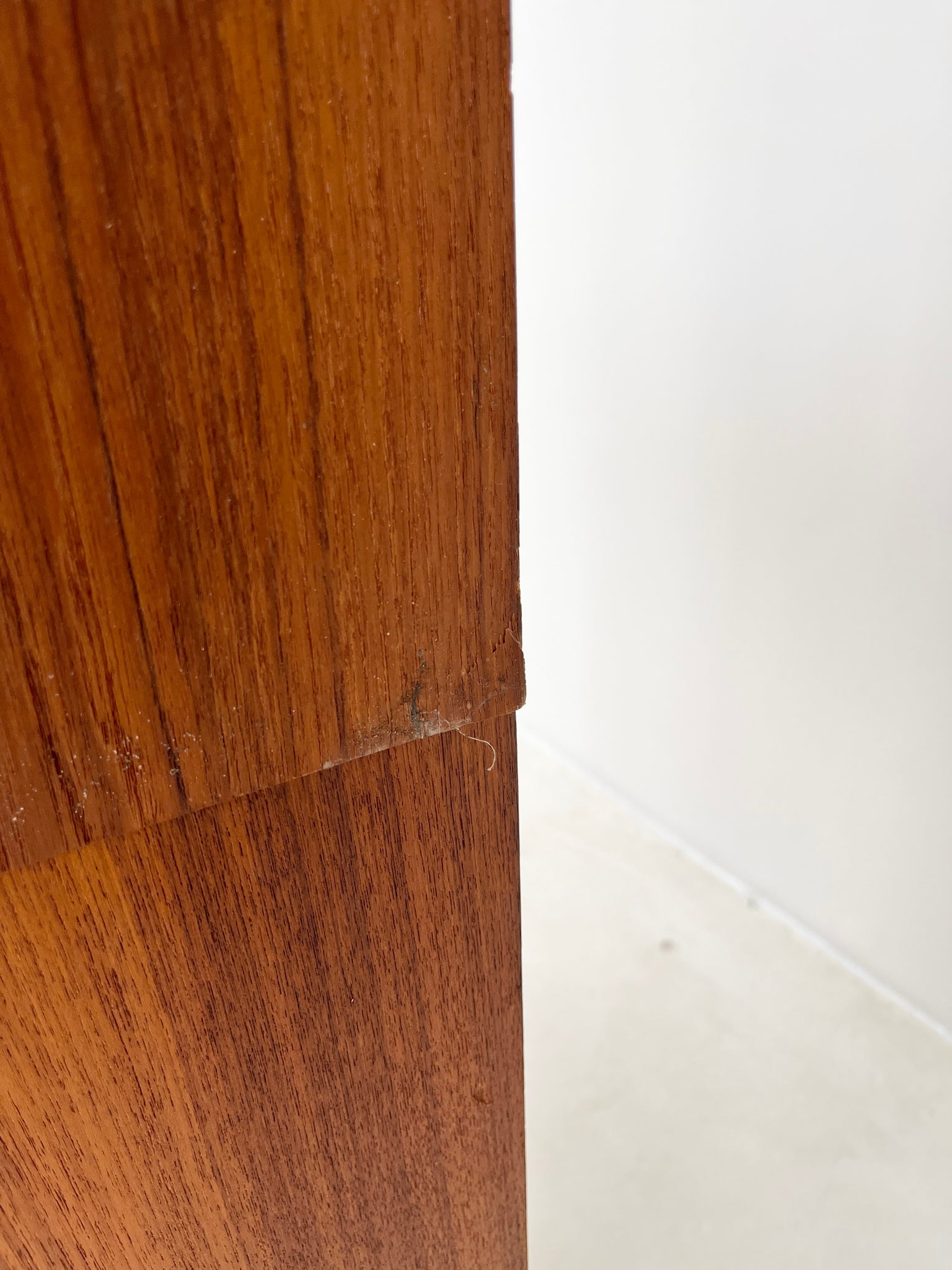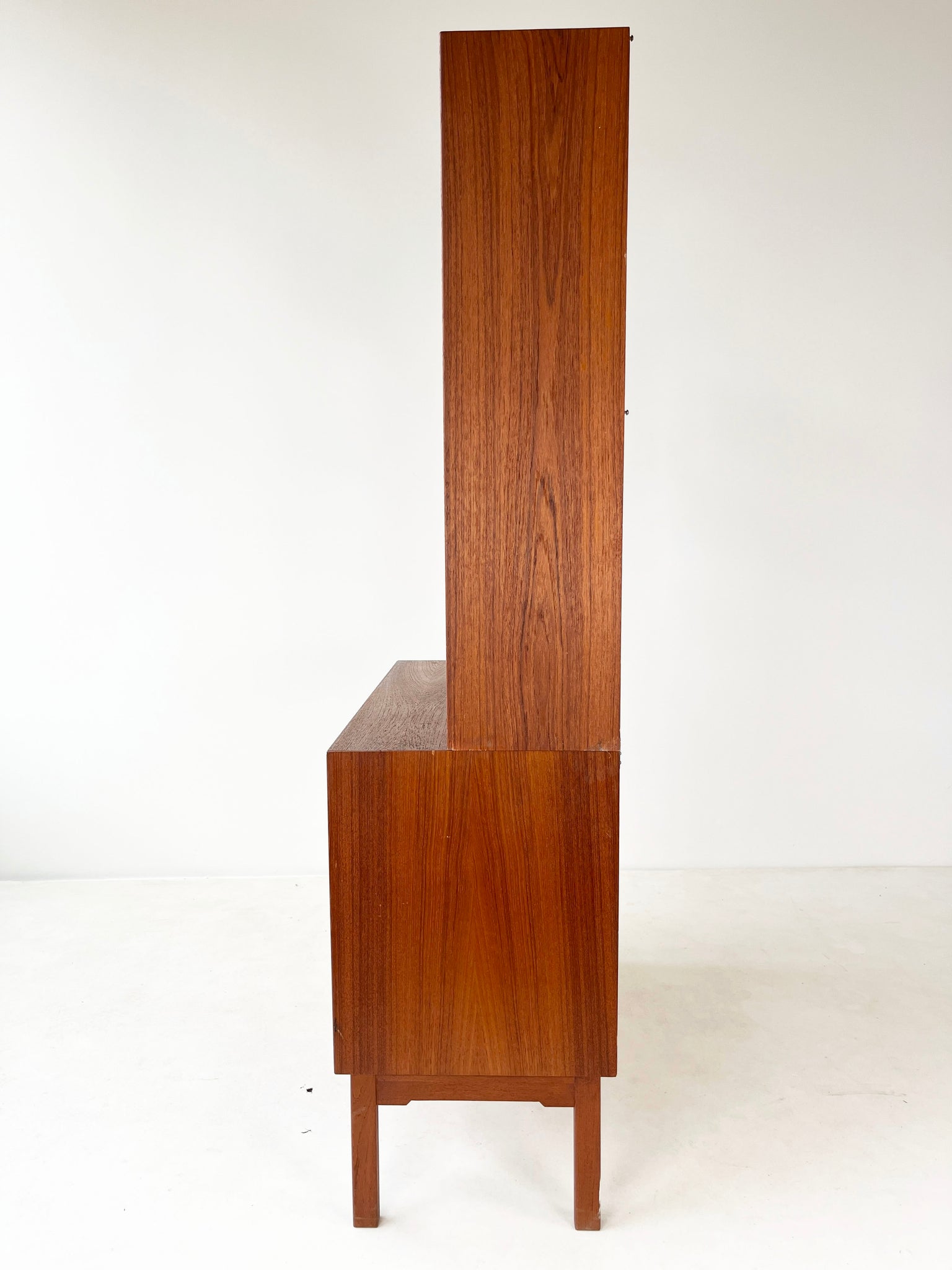 Strakke vintage wandkast van mooi donker teakhout. Het boekenkastgedeelte zit los op het onderkastgedeelte, wat handig is voor transport, maar kan eenvoudig aan elkaar worden bevestigd. Voorzien van een werkend slot. Lichte beschadigingen aan het fineer, zichtbaar op de foto’s.